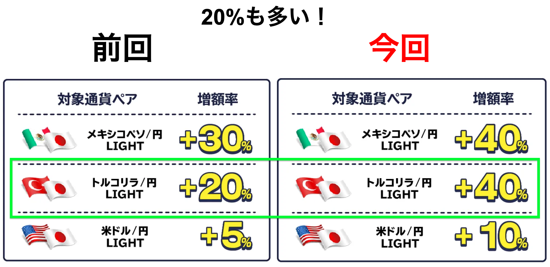 前回はトルコリラ円の増量は20%だったのですが、今回は40%も増量!!