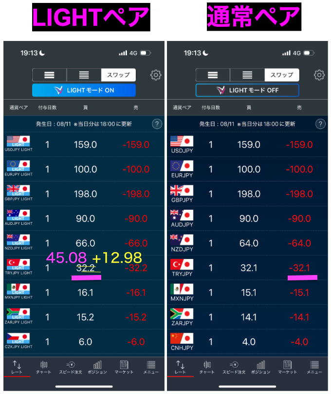 買いのスワップポイントは本来32.2円ですが、40%増量後は45.08円となり、マイナススワップ-32.1円を引くと、+12.98円が為替リスクほぼゼロでもらえちゃいます(● ˃̶͈̀ロ˂̶͈́)੭ꠥ⁾⁾💞💞💞