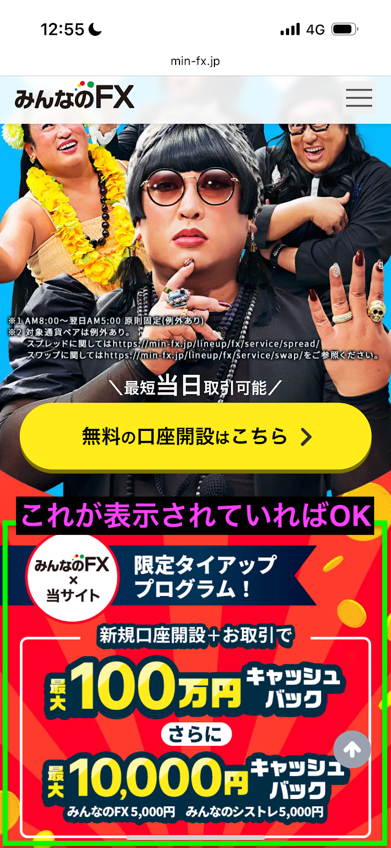 まずは、下の緑のボタンから「みんなのFX × 投資OL社長ちゃん タイアップ特設ページ」に飛びます。