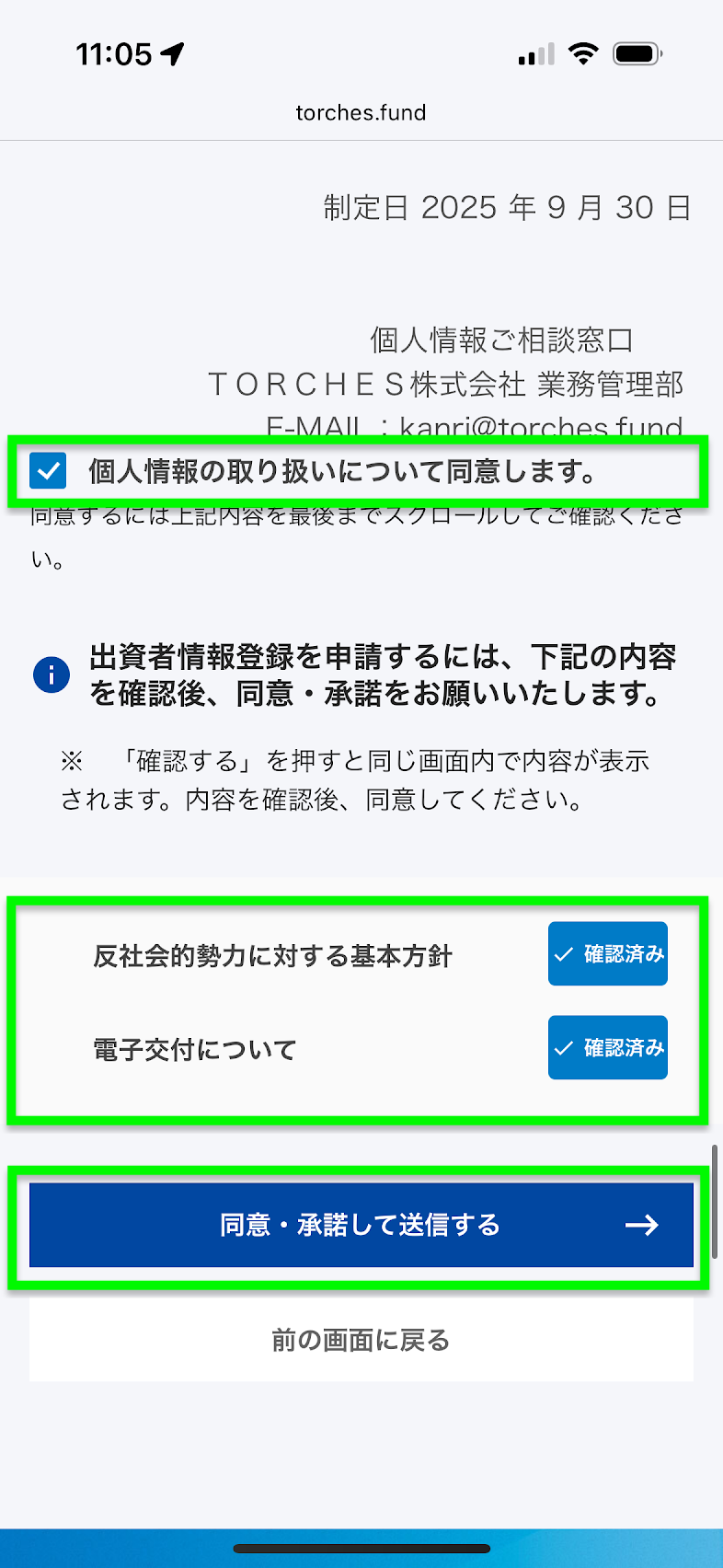 自分が入力した情報が正しいことを確認したら、反社チェックと電子交付のところをチェックして、「同意して送信する」押す