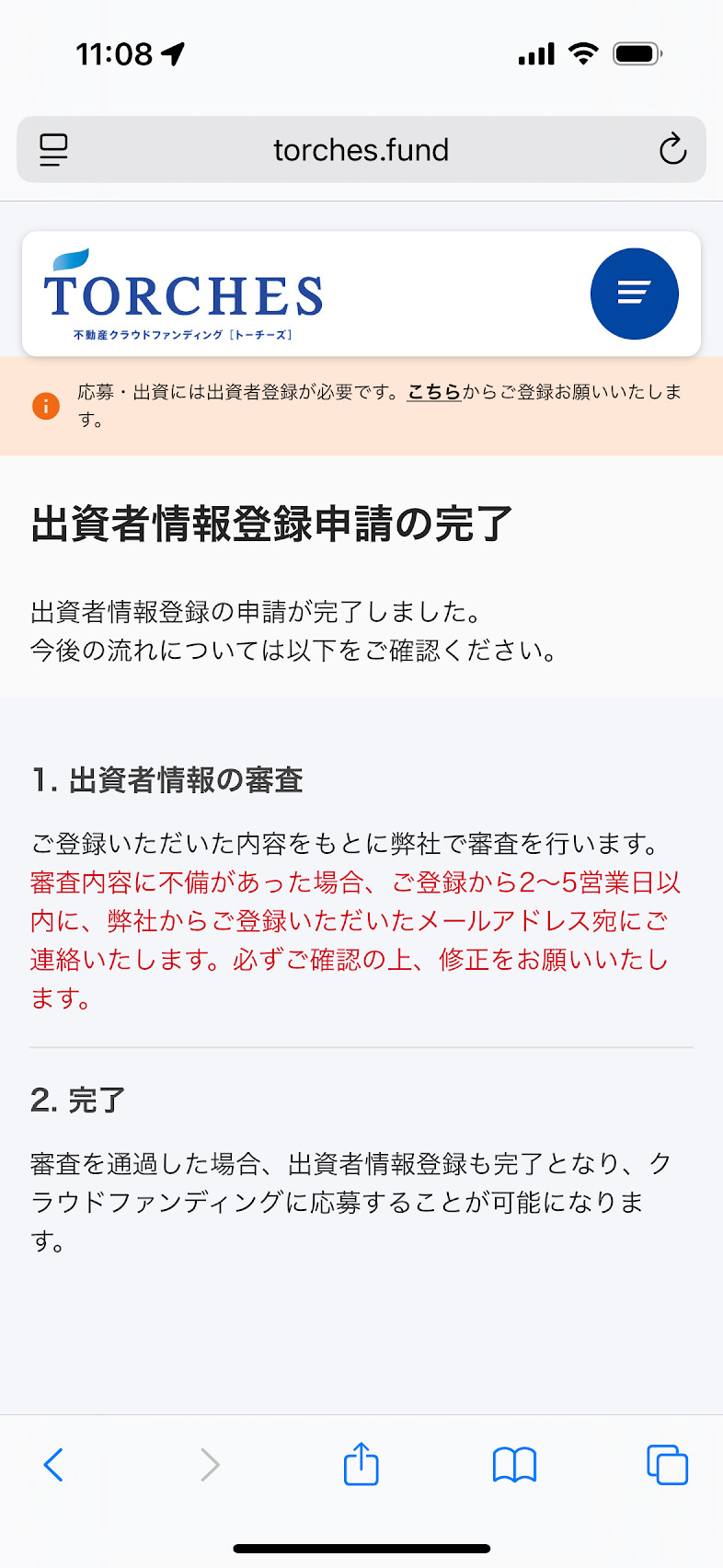 本人確認がうまくいくと「出資者情報登録申請の完了」と表示されます❤️