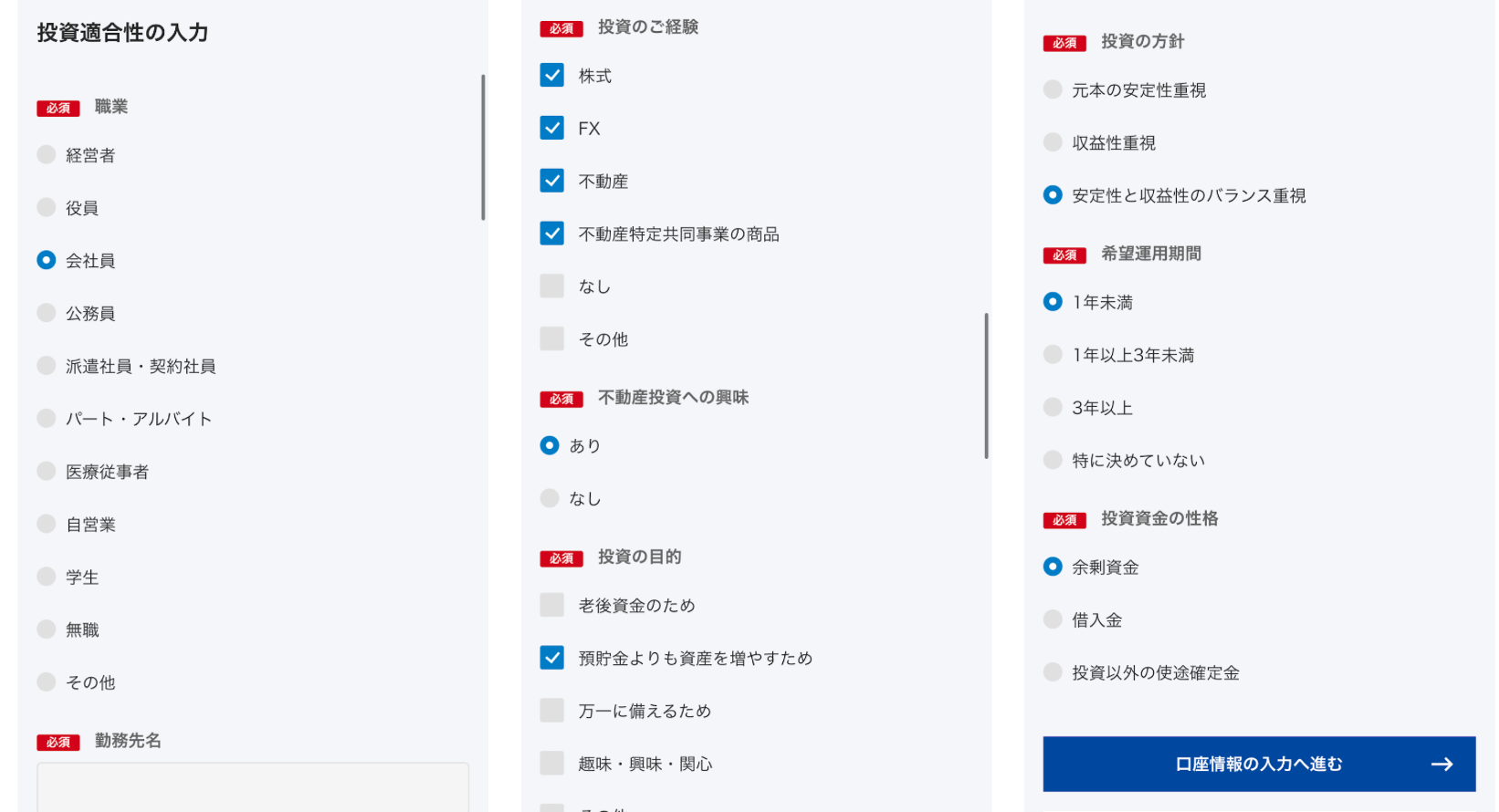名前、投資の経験などを入力していきます。